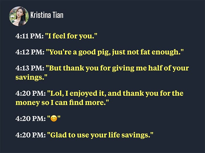 After that call, he turned to WhatsApp, where “Kristina” called him a “Good Pig” and sent smiley faces back at him, saying she was “glad to use his life savings.”