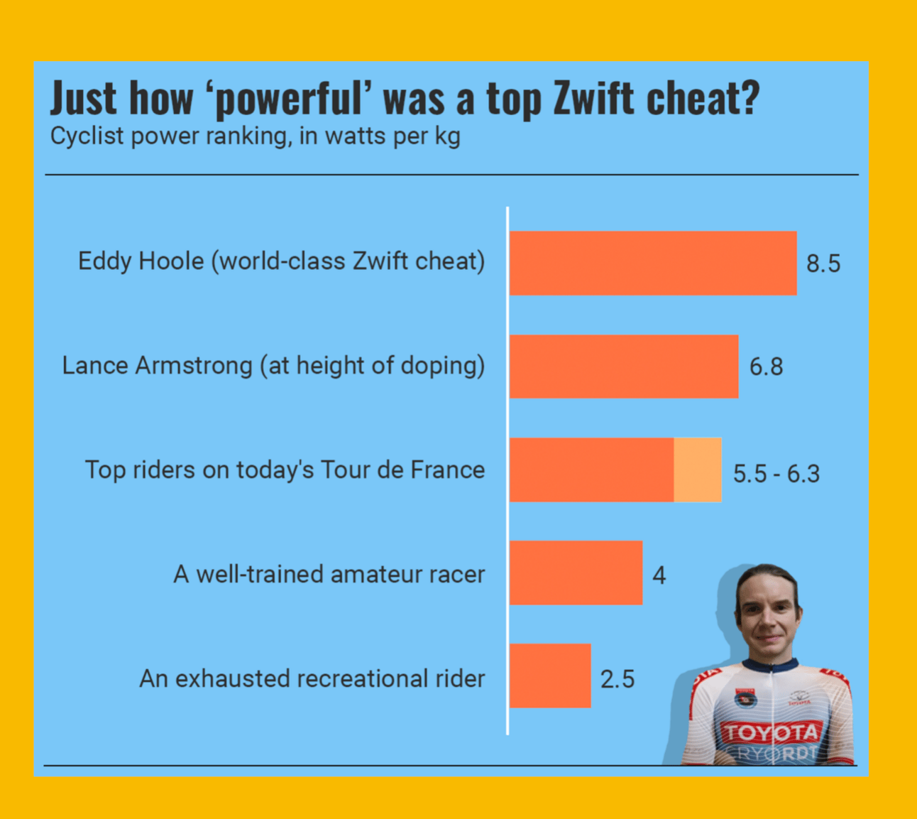 Not even Lance Armstrong at the top of his doping is any match to the strength and power of world-class Zwift cheater Eddy Hoole!