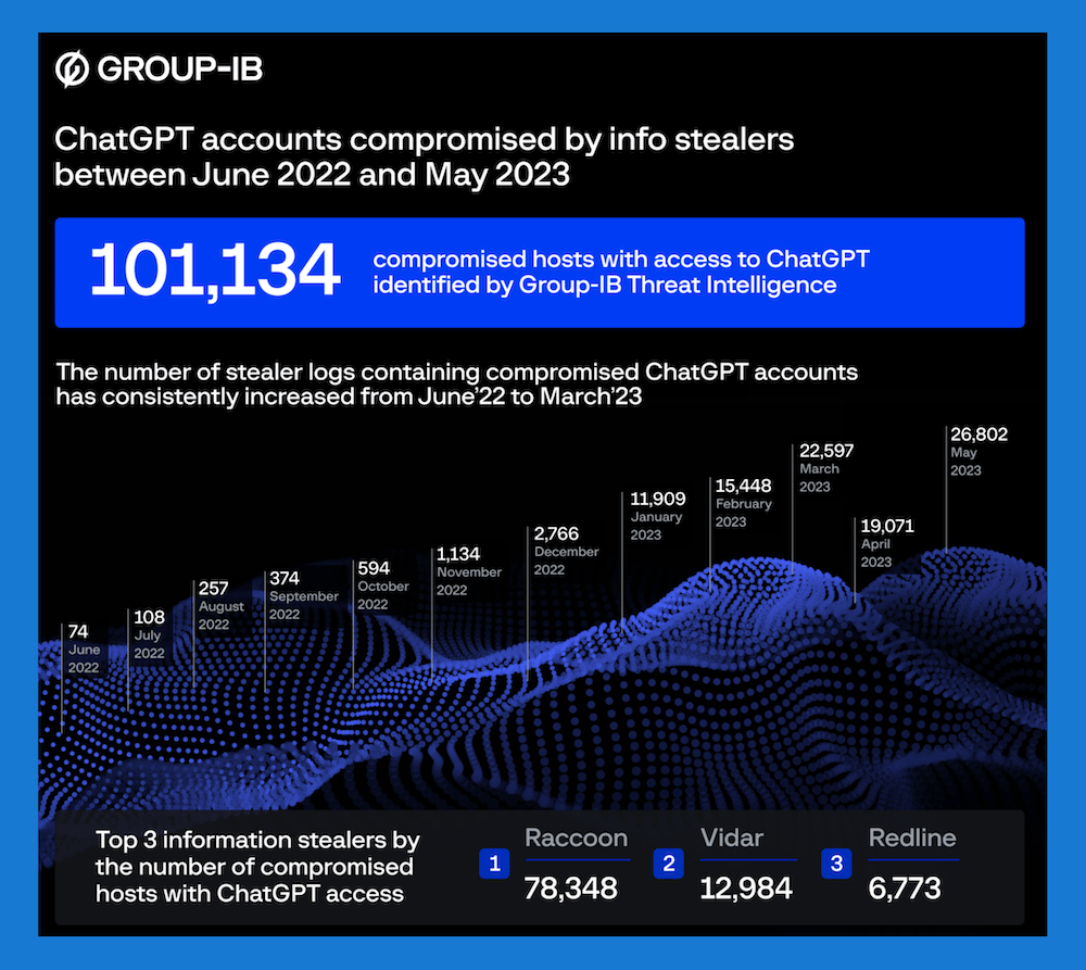 Fresh from the cyber-sleuths at Singapore-based Group-IB, over 100,000 ChatGPT accounts have been hijacked by info-stealing malware and are up for grabs in the illegal bazaars of the dark web.
