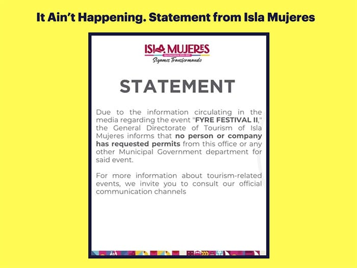 However, officials on the Island claimed no permits had been requested, hotels confirmed no partnerships with the Festival, and the only act announced was that of Antonio Brown, former wide receiver for the Pittsburgh Steelers.