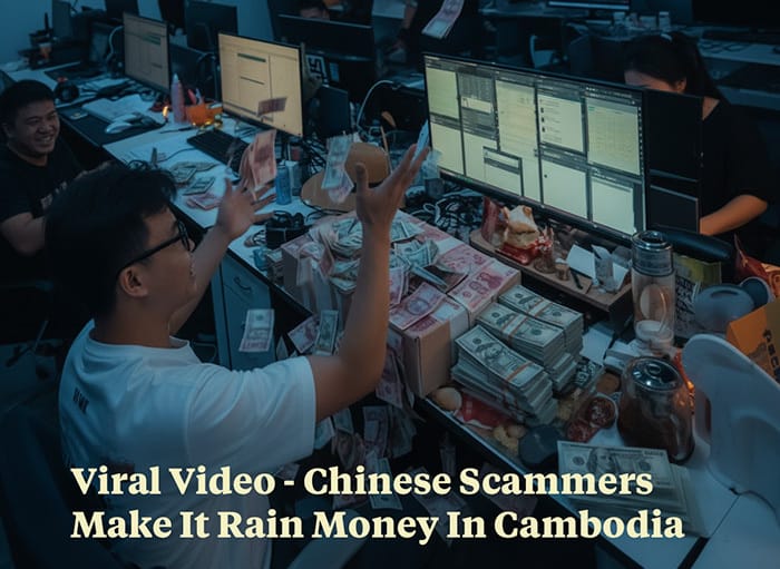Chinese scam bosses in Cambodia appear to have no fear of Cambodian officials. This viral video is spreading in Cambodia depicting the scammers with piles of cash at their desk and making it rain money. 💸